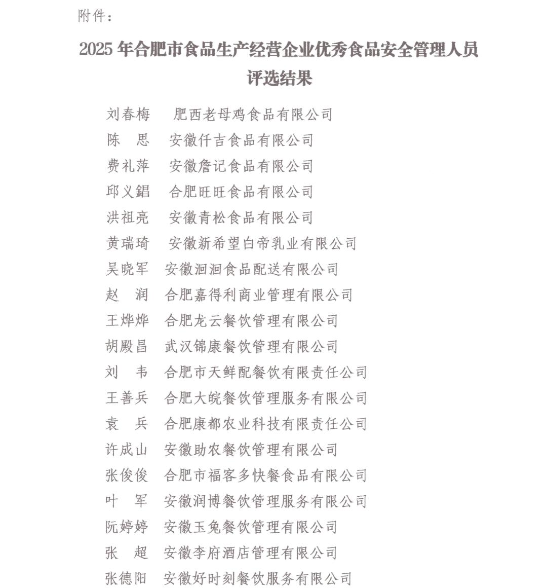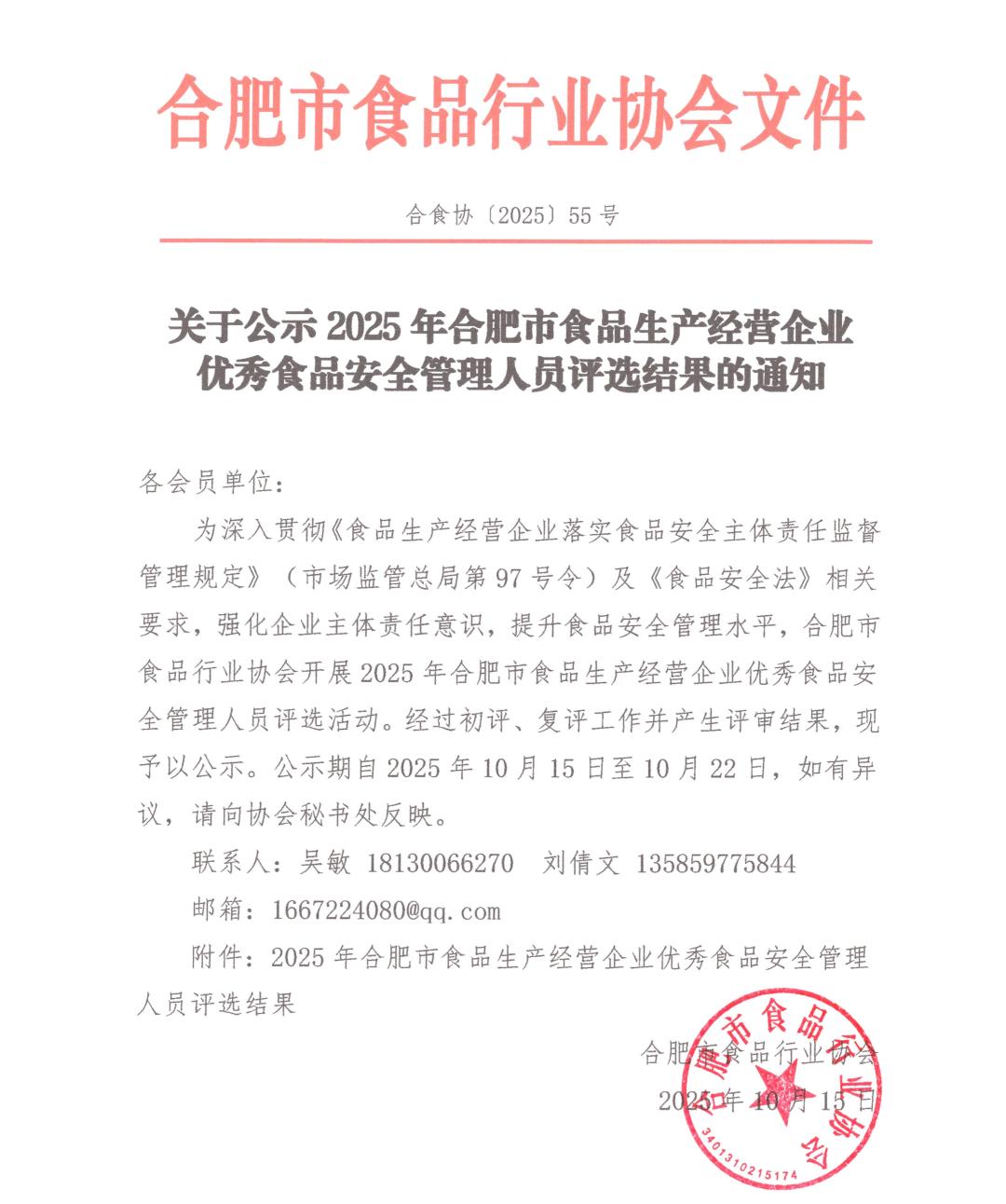 关于公示2025年合肥市食品生产经营企业优秀食品安全管理人员评选结果的通知